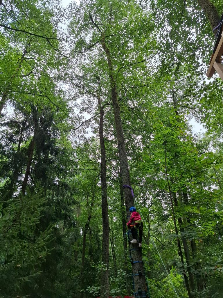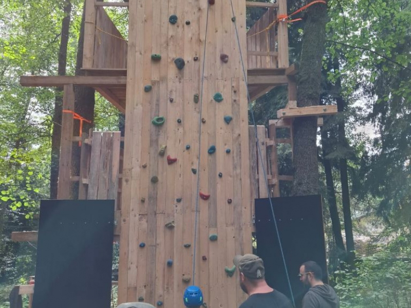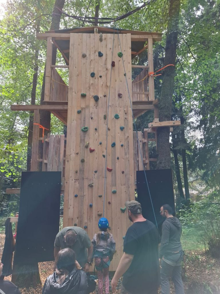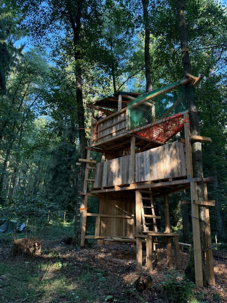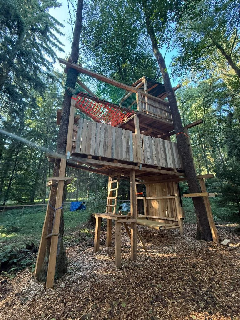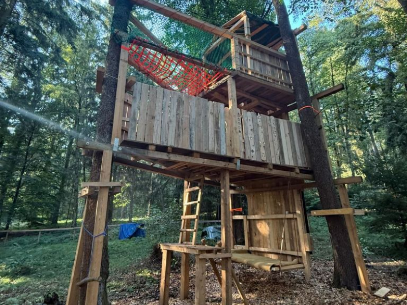 Aber alles der Reihe nach: vor einiger Zeit entstand bei den Kindern die Idee, dass es doch schön wäre, ein Baumhaus sowie eine Kletterwand an der Hauswand zu haben und wie es bei finofamilia so üblich ist, werden die Ideen der Kinder gerne aufgegriffen und dann, soweit möglich, zusammen in die Tat umgesetzt. Ziel war es, bis zum Elterntag am 12. September das fertige Werk der Öffentlichkeit, also den Eltern zu präsentieren. Und genauso kam es auch. Nun hat sich ein Baumhaus mit zwei Ebenen mit integrierter Kletterwand im Wald unseres Standortes in Zeinried verwirklicht. Federführend war und ist unser langjähriger Mitarbeiter Andy, welcher auch als Erlebnispädagoge große Erfahrung und Wissen mitbringt, was er gerne weiter gibt und von dem alle profitieren können.